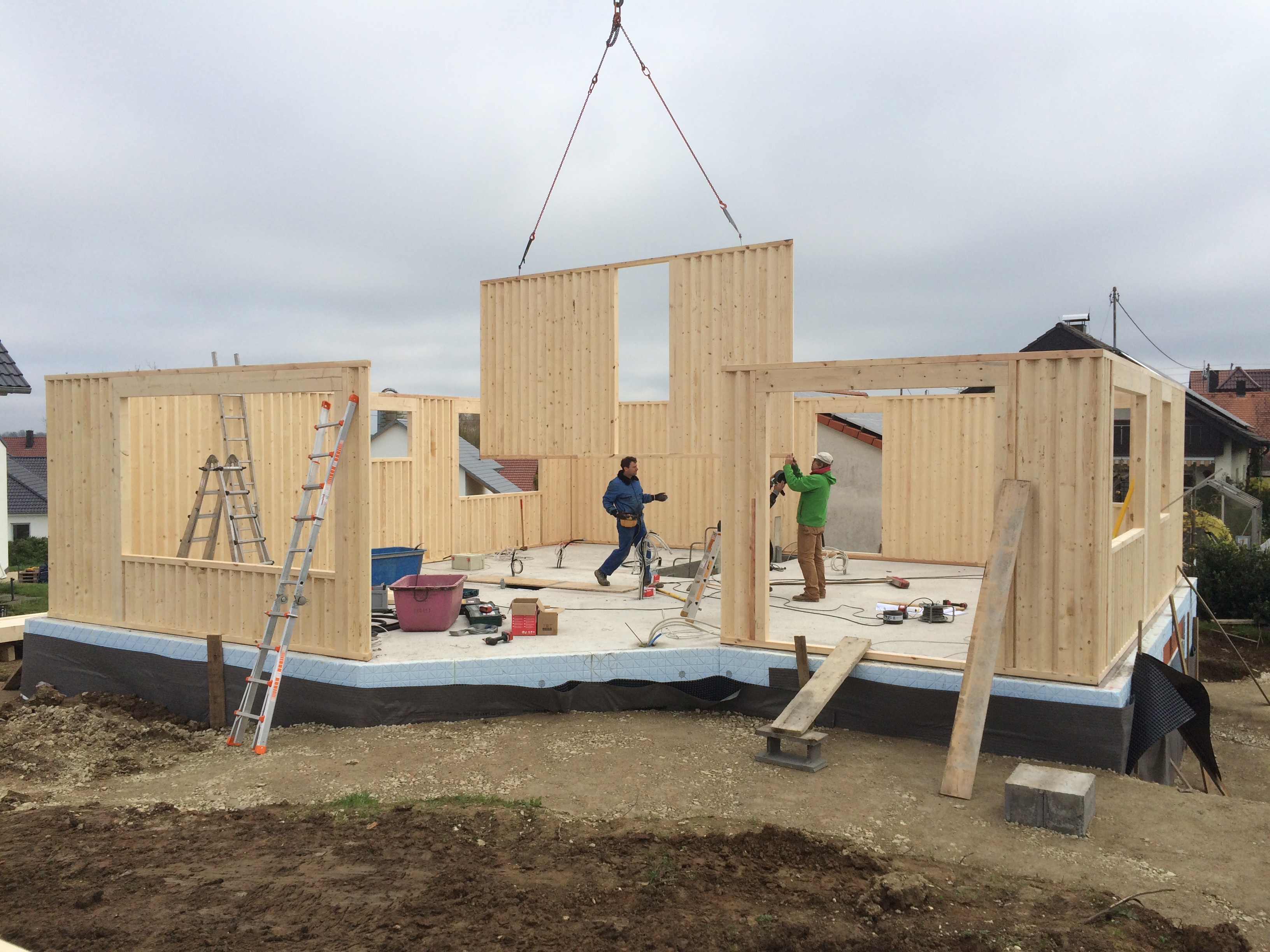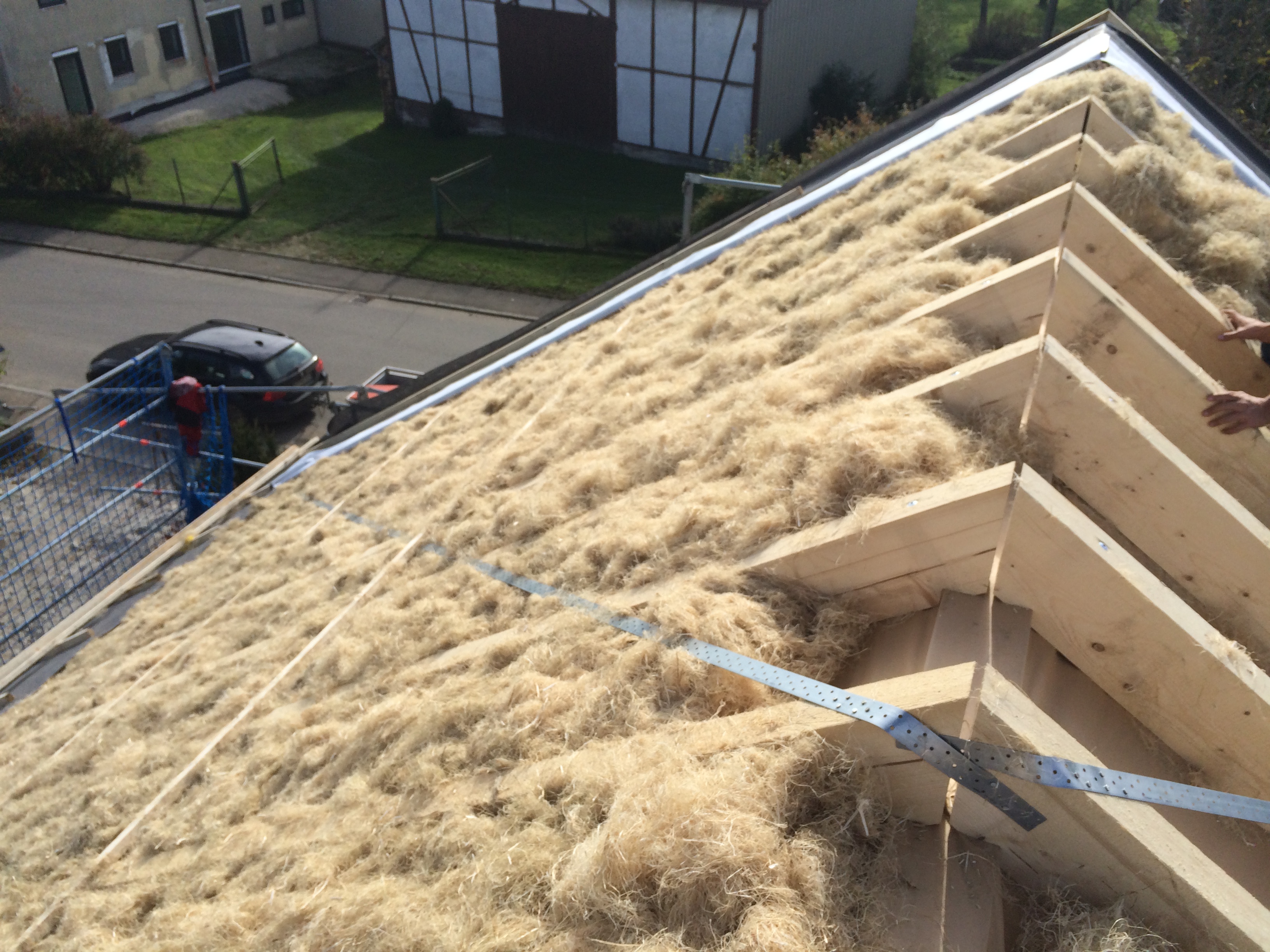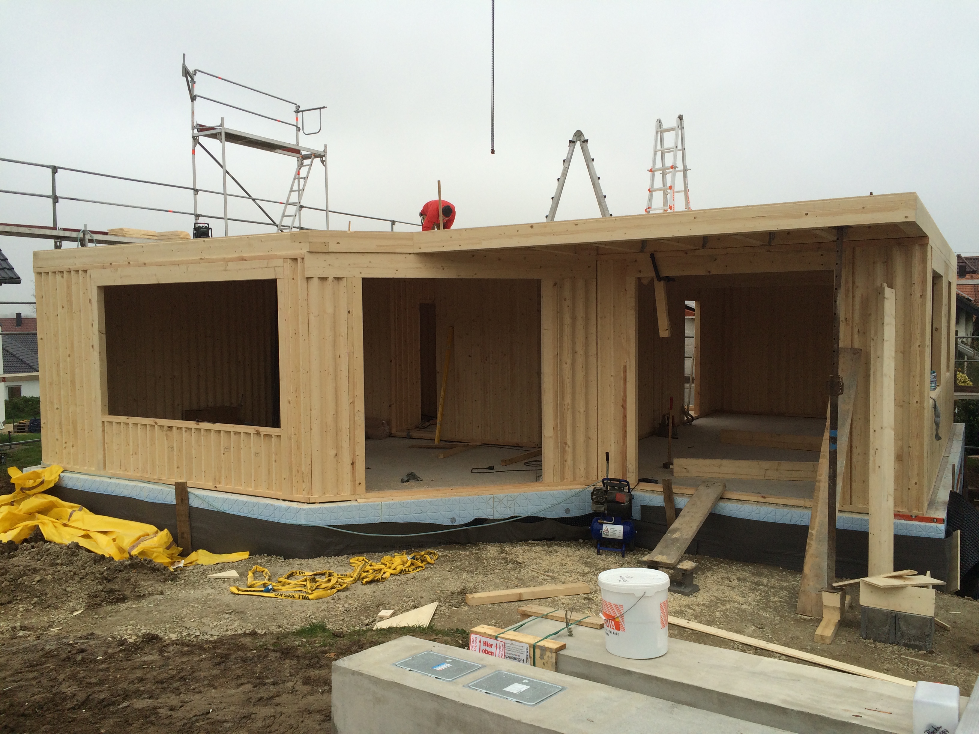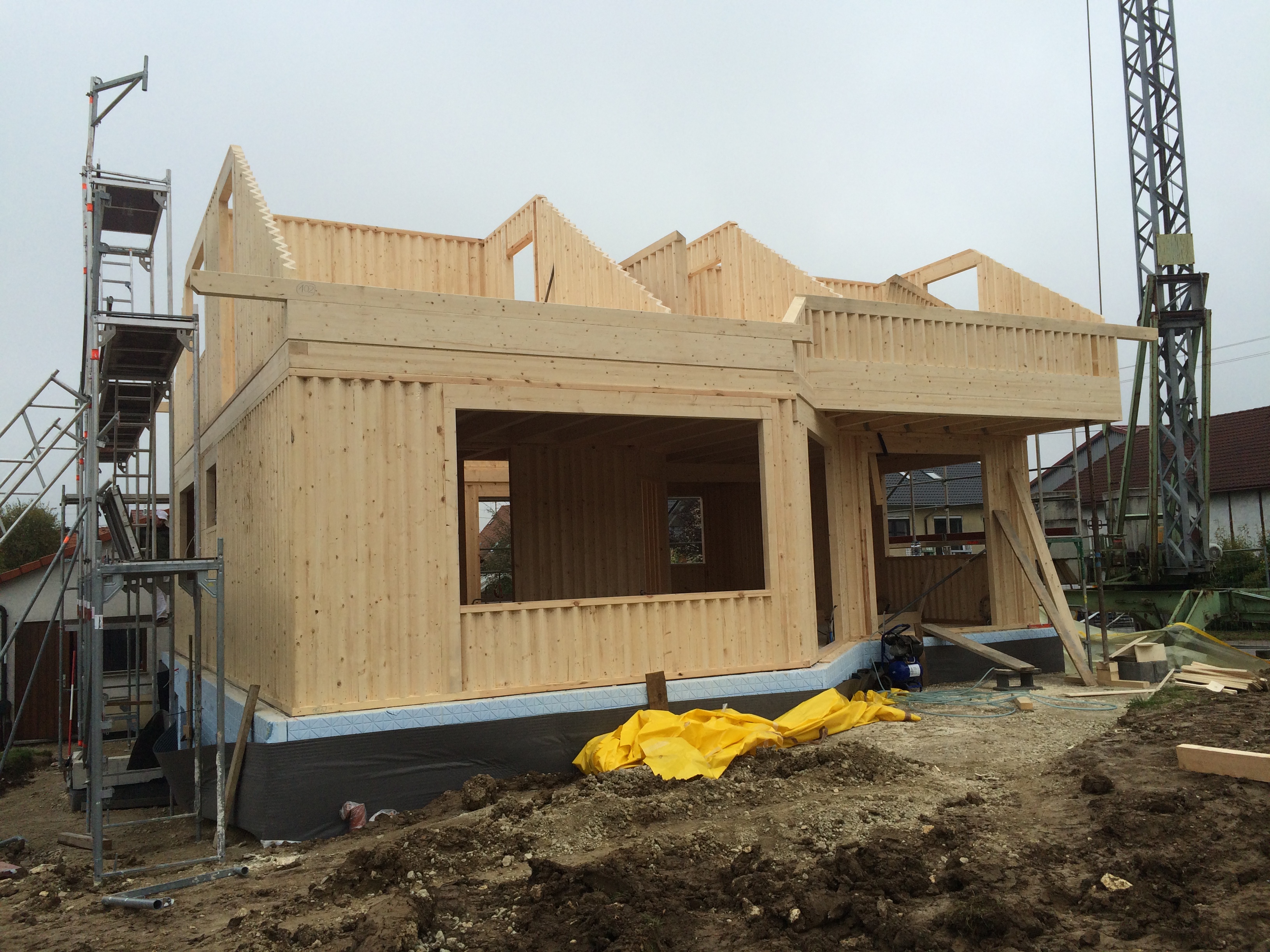 Einfamilienhaus in Holzbauweise Ausgeführte Arbeiten: Holzbau; Dachaufbau mit Wärmedämmung aus Hanf und Holzfasser ; Fassadenaufbau mit Wärmedämmung aus Hanf und Holzfasser; Dachdeckung