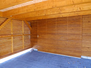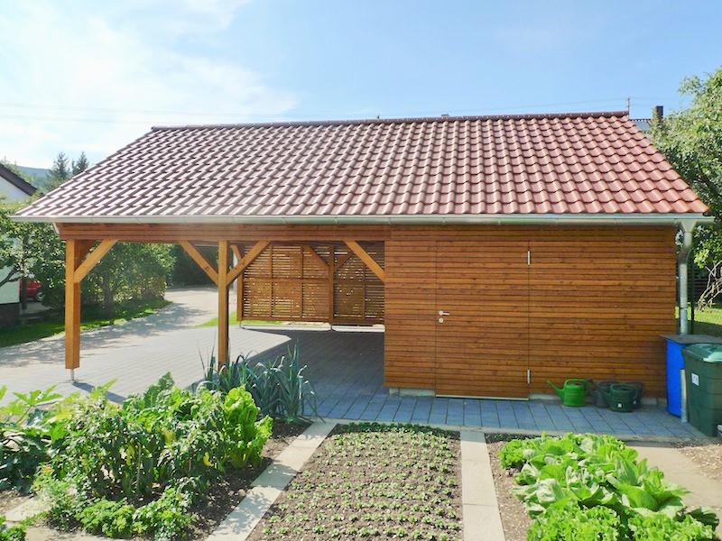 Großzügiger Carport Carport für zwei Autos und abschließbarer Raum für Gartengeräte mit Rolltor. Dachraum mit Einschubtreppe als Lager. Ausgeführte Arbeiten: Zimmererarbeiten, Dachdeckerarbeiten,Fassadenarbeiten und Flaschnerarbeiten.